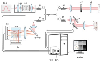 光學(xué)相干層析成像(Optical Coherence tomography)技術(shù)是一種非侵入(無損)、非接觸微米級(jí)分辨率的成像技術(shù),利用光學(xué)相干門來獲得組織內(nèi)部的層析結(jié)構(gòu)。譜域OCT(Spectral domain OCT, SD-OCT)是第二代OCT技術(shù),相比傳統(tǒng)的第一代時(shí)域OCT技術(shù),在成像速度、信噪比和靈敏度等方面具有明顯優(yōu)勢(shì),在眼科成像、功能成像、生物醫(yī)療等領(lǐng)域發(fā)揮了重要作用。