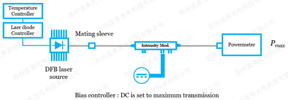 直流偏壓的半波電壓VπDC僅僅適用于強度調制器,而非相位調制器(無偏壓接口)。VπDC是電光調制器,通過DC偏壓調節(jié),傳輸的光波引入一個相移所需的電壓。對于強度調制器,即M-Z干涉儀,半波電壓(Vπ)對應為將光輸出功率從最大Pmax改變?yōu)樽钚min時的DC偏壓值,(參考調制器的傳輸曲線MTF),其測量方法同前面靜態(tài)消光比的測量,只不過此時記錄電壓值的差值。