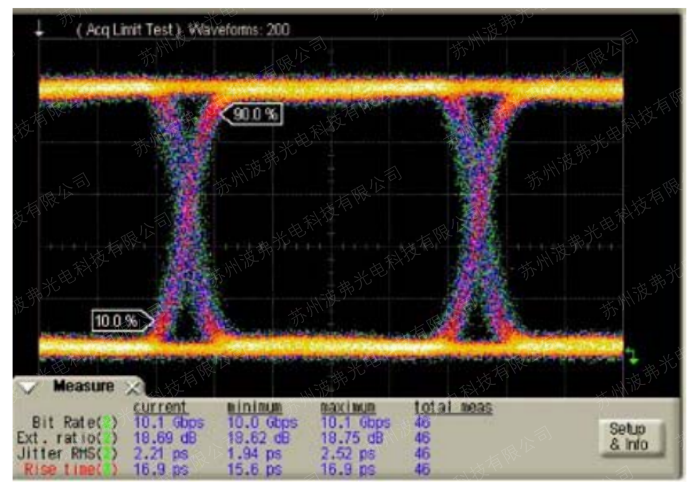 動態(tài)消光比的測量需要接入射頻RF電信號在調制器的射頻端口,并且DC偏壓設置在所做應用的合適工作點上(通常Quad+,Quad-,Min,詳見調制器的偏壓控制文章)。所以,動態(tài)消光比是和最終應用相關的。例如數字調制方式(10Gb/s,通過MX-LN-10調制),如下圖,通過PRBS產生射頻電信號,偏壓控制在Quad點上,通過高速示波器,我們測量的眼圖最高和最低水平的比值-動態(tài)消光比是18.6dB(見示波器測量數值Ext. Ratio)。