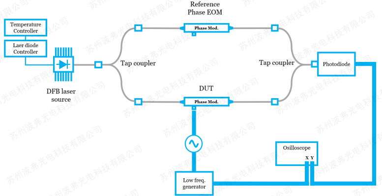 對于相位調制器測量VπRF,必須將相位的變化轉變?yōu)閺姸鹊淖兓_@有很多方法:其一包括45度入射相位調制器波導(偏振波導APE工藝不適用,通常iXblue 1um及其以下波長調制器為偏振波導),建議一個干涉儀系統。其二可通過在一路光路中加入相位調制器,建議法布里-珀羅干涉儀。更多方法,請參考我們應用指南”相位調制器帶寬測試”應用指南。