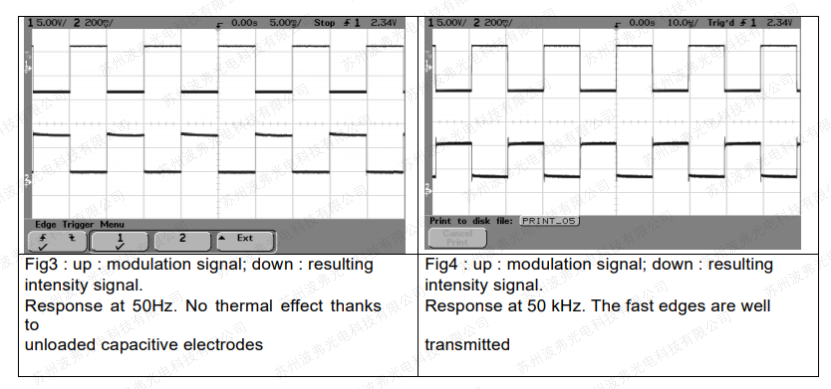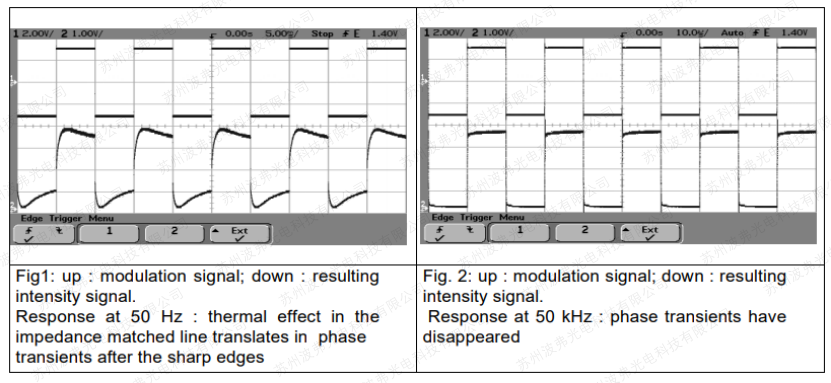 下面的圖1和圖2示出了當(dāng)使用50Hz和50KHz方波調(diào)制信號時,使用高帶寬相位調(diào)制器(MPZ-LN-20型,>20GHz電光帶寬)。熱效應(yīng)的影響在圖1中非常低頻時清晰可見,在50kHz時熱效應(yīng)幾乎消失