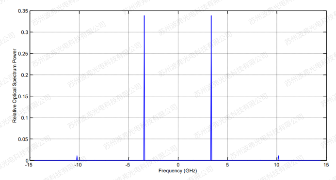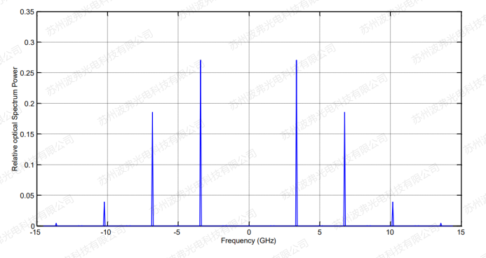 從上圖可以看出,當(dāng)調(diào)制深度為2.4的時(shí)候,載波消失,請參考微信文章“電光調(diào)制器半波電壓隨頻率的變化”,CS-SSB情況下,下圖為相位調(diào)制器輸出光譜的模擬計(jì)算結(jié)果,載波在”0”所處位置消失,±1階,±2階和±3階邊帶清晰可見,左右對稱分布。