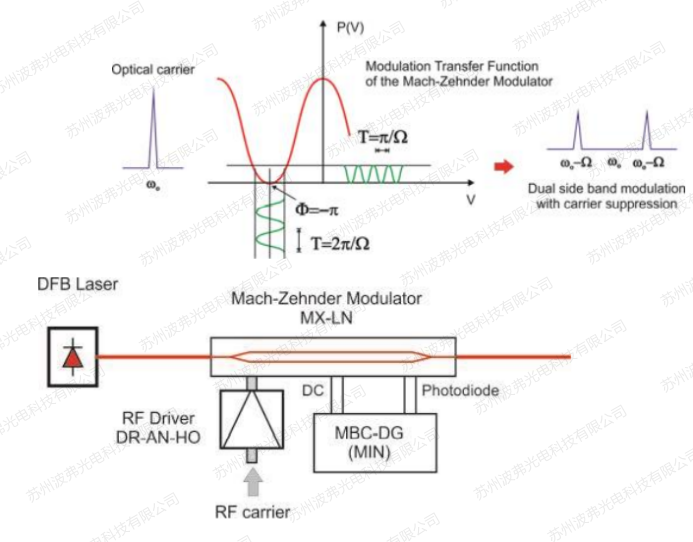 以上兩種方式,如果僅需要單邊帶,均需要FBG過濾掉不希望的多階光譜。而FBG多為定點(diǎn)頻率和帶寬,這無形中限制了這種方案在掃頻方面的應(yīng)用。而且,FBG一般較好的投射/反射率<99%,僅僅相當(dāng)于20dB的載波或邊帶抑制比,在一些特定應(yīng)用中,希望得到更高的抑制比時(shí)這兩種方案就顯得無能為力了。為了解決上面的問題,一種新的載波抑制-單邊帶調(diào)制方案就應(yīng)運(yùn)而生了。