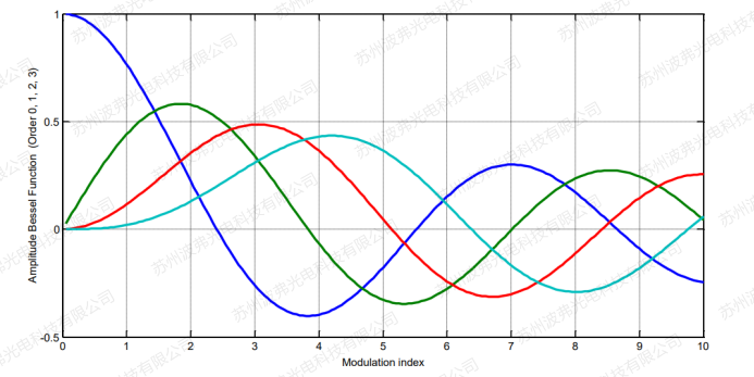 其輸出光譜服從貝塞爾函數(shù)分布,如下圖,藍(lán)色代表載波,其他依次為±1,±2,±3階邊帶,輸出光譜強(qiáng)度隨調(diào)制深度的變化(Modulation index),此調(diào)制深度也可等效理解為調(diào)制器的驅(qū)動電壓。