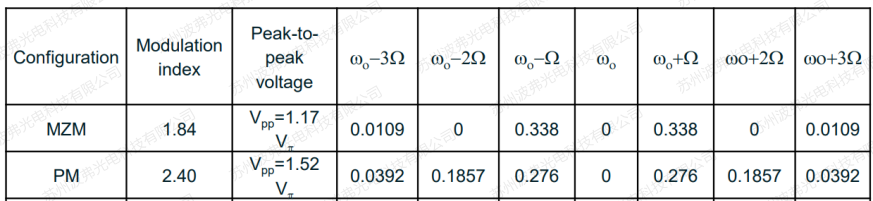 3. 強(qiáng)度調(diào)制器所產(chǎn)生的1階邊帶強(qiáng)度高于相位調(diào)制器(見下表),因?yàn)橄辔徽{(diào)制器有部分強(qiáng)度分布在其他階邊帶上