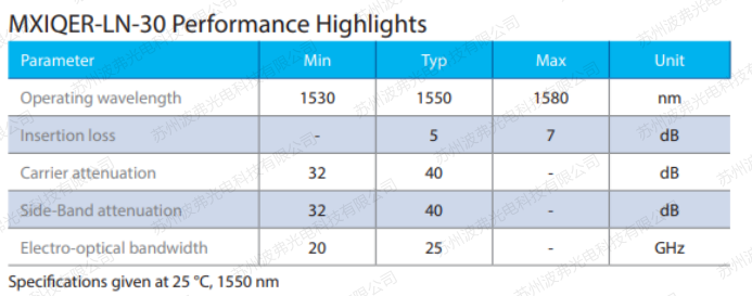 iXblue的MXIQER-LN-30是一款高帶寬,低插損,高抑制比的雙平行M-Z調(diào)制器,iXblue 專利技術(shù)“Magic Junction” (patent n° US2008193077)保證高達(dá)30dB以上的載波和邊帶抑制比。