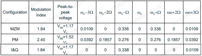 強(qiáng)度(MZM)和相位(PM)調(diào)制器在載波抑制情況下,調(diào)制深度(Modulation index),調(diào)制器驅(qū)動電壓(Peak-to-peak voltage),載波ω0, ±1階(ω0±Ω),±2階(ω0±2Ω)和±3階(ω0±3Ω)