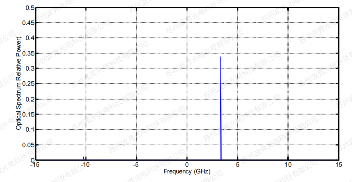 在CS-SSB情況下,下圖為IQ調(diào)制器的輸出光譜的模擬計(jì)算結(jié)果,載波在”0”所處位置消失,+1階清晰可見,-3階光譜少許出現(xiàn)。