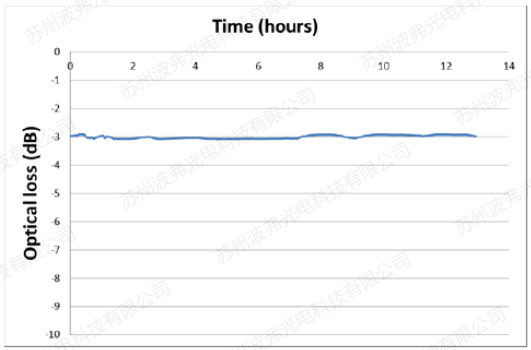 Figure 3 :使用退火質(zhì)子交換工藝的NIR-MX800-LN調(diào)制器插入損耗隨時間的穩(wěn)定性變化