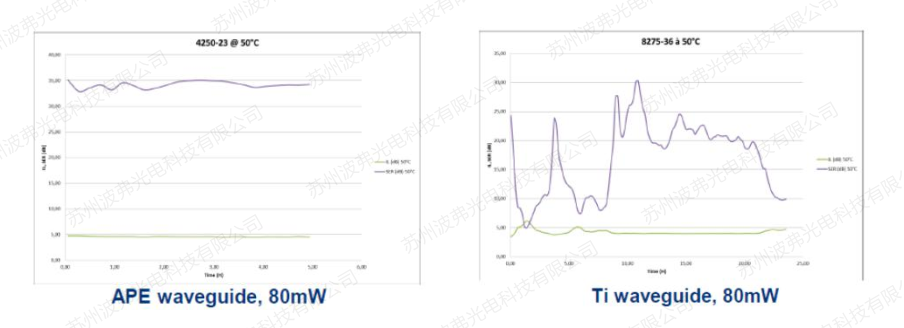 再一次聲明,即使在某些廠商的參數(shù)手冊上,鈦擴(kuò)散工藝制造出的調(diào)制器在近紅外波段優(yōu)于退火質(zhì)子交換工藝,但是鈦擴(kuò)散工藝的光折變效應(yīng)會在低激光功率時更早的介入,器件的性能將不再受控。所有iXblue近紅外波段的調(diào)制器使用退火質(zhì)子交換工藝,減小光折變的影響,提供更穩(wěn)定的性能。