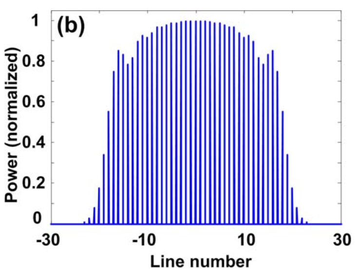 光學(xué)頻率梳(Optical Frequency Comb)是由一系列離散、等間距的規(guī)則光脈沖序列組成,能夠在一個(gè)頻段內(nèi)同時(shí)提供幾個(gè)至上百個(gè)個(gè)不同的頻率成分。具有梳線數(shù)目多、頻率范圍廣等優(yōu)勢(shì),且具有固定的頻率間隔等,能夠代替多個(gè)激光器,是理想的多載波光源。