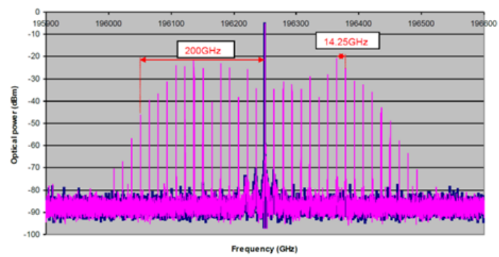 基于鈮酸鋰電光調(diào)制器所產(chǎn)生的光學(xué)頻率梳,原理是通過鈮酸鋰相位調(diào)制器(Phase Modulator),鈮酸鋰強(qiáng)度調(diào)制器(Intensity Modulator)的邊帶產(chǎn)生(參考微信公眾號(hào):使用電光調(diào)制器實(shí)現(xiàn)邊帶調(diào)制),通過串聯(lián)鈮酸鋰相位調(diào)制器、強(qiáng)度調(diào)制器實(shí)現(xiàn)高平坦度(~2dB),多梳線光學(xué)頻率梳產(chǎn)生,最終產(chǎn)生上百個(gè)梳線的頻率梳?;阝壦徜囌{(diào)制器產(chǎn)生的光學(xué)頻率梳具有中心頻率已于調(diào)節(jié),重復(fù)頻率可控等優(yōu)勢(shì)。