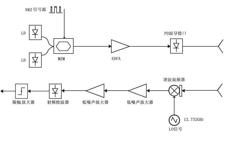 太赫茲頻段由于其寬帶特性,在通信、雷達(dá)、特征頻譜檢測等領(lǐng)域具有巨大應(yīng)用潛力。為了使短距離無線通信的數(shù)據(jù)速率達(dá)到10Gbps,利用光電結(jié)合技術(shù)以THz波段(125GHz)為載波,建立太赫茲無線通信系統(tǒng)。如下圖所示使用62.5GHz信號調(diào)制光波,通過平面分波電路產(chǎn)生相隔0.125THz光信號,此光信號受發(fā)射數(shù)據(jù)的調(diào)制,然后進(jìn)入PD,進(jìn)行光電轉(zhuǎn)換,產(chǎn)生0.125TH組的調(diào)制波,經(jīng)過放大后饋入天線發(fā)射,接收端經(jīng)天線后進(jìn)入低噪放,檢波成基帶信號,經(jīng)過放大,數(shù)據(jù)恢復(fù)。