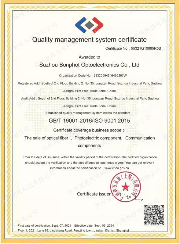 蘇州波弗光電科技有限公司已于今日通過GB/T 19001-2016/ISO 9001:2015質(zhì)量管理體系認(rèn)證。