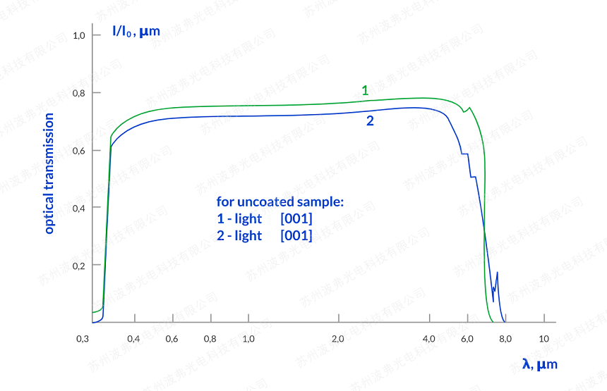 標(biāo)準(zhǔn)TeO2材料在0.450-5 mkm范圍內(nèi)更好;標(biāo)準(zhǔn)TeO2晶體在特殊技術(shù)下生長,最大透射率在0.350 - 0.450 mkm范圍內(nèi),適用于對澄清效應(yīng)敏感的應(yīng)用;在特殊技術(shù)下生長的標(biāo)準(zhǔn)TeO2晶體最大限度地減少了2.7 - 3.2 mkm范圍內(nèi)的-OH基團(tuán),以滿足應(yīng)用所需的平面?zhèn)鬏敺秶?