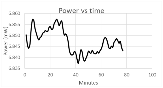 功率與時間的關(guān)系圖@(室溫,1.5h)顯示了出色的功率穩(wěn)定性,適用于插入損耗測試等應(yīng)用。