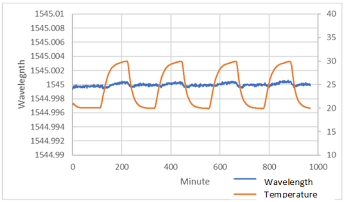 環(huán)境溫度在10°C范圍內(nèi)循環(huán)時,范圍內(nèi)任何位置的一般波長的波長與時間的關(guān)系。總漂移小于1pm。ClarityPlus可以為C波段的任何波長生成可追溯到NIST的波長。