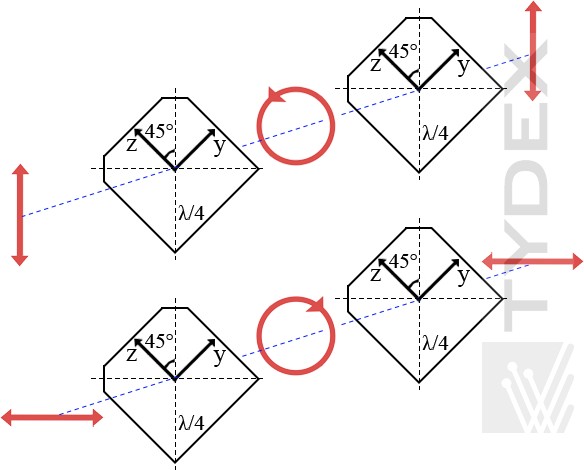 由雙折射材料制成的平平板用于改變輻射的偏振態(tài)。 波片通過移動(dòng)波的兩個(gè)垂直偏振分量之間的相位來工作。 最常見的波片類型是半波片(λ/2 片)和四分之一波片(λ/4 片)。 λ/2 板給出相位延遲 π 和 λ/4 板 — π/2。 半波片改變線偏振光的偏振方向。 四分之一波片將線偏振光變?yōu)閳A形,反之亦然。 如果偏振方向沿波片軸之一,波片不會(huì)改變線偏振光束的偏振。