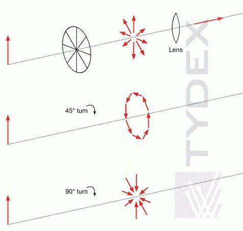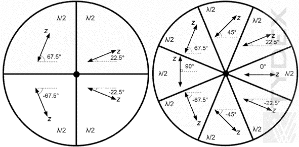 由幾個(gè)特殊定向的半波片組成的分段波片允許從線性偏振的輻射獲得徑向和方位角偏振的輻射。 這種波片的工作原理如下所示。