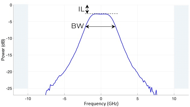 典型響應(yīng)(IN ? OUT):具有改進(jìn)的Q因子的平頂對稱帶通設(shè)計(jì),可實(shí)現(xiàn)更好的選擇性和更高的信噪比。 |