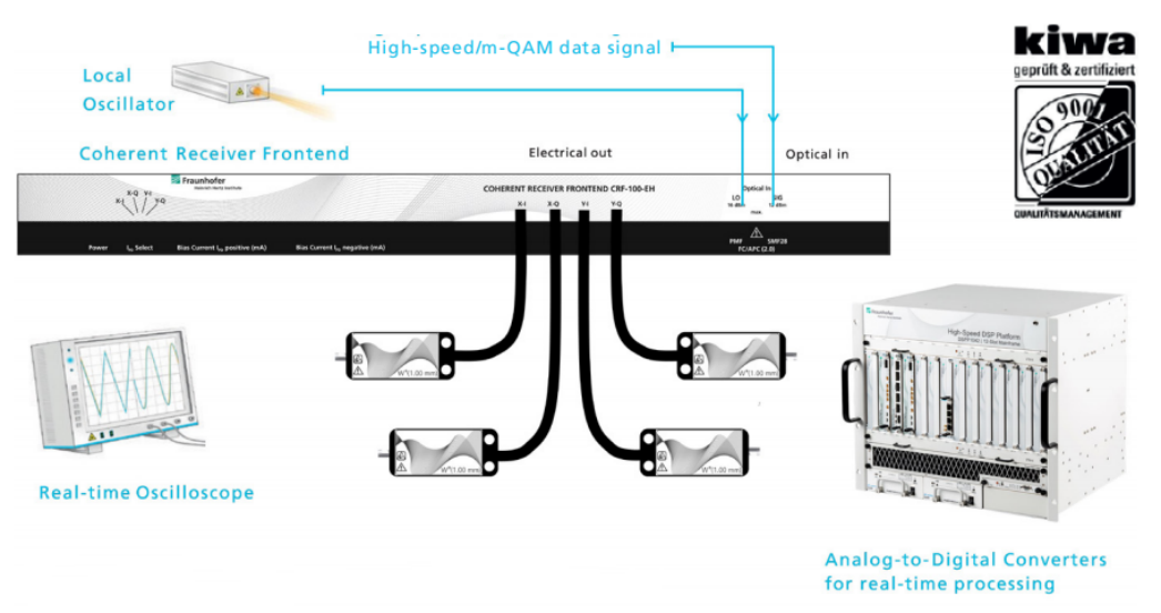 緊湊型19英寸機(jī)箱中的光學(xué)相干接收機(jī),100 GHz帶寬,包括C或L波段可選LO激光器,高速光學(xué)雙偏振m-PAM和m-QAM信號(hào)的相干檢測(cè)。