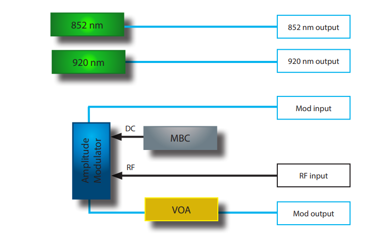 ? 內(nèi)嵌兩個(gè)激光源,一個(gè)852 nm和920 nm低RIN DBR激光器。為了便于使用,省略了一根外部接插線,將激光輸出連接到調(diào)制器輸入光端口。波長(zhǎng)和功率可通過(guò)前面板控制或ModBox軟件接口進(jìn)行調(diào)整。