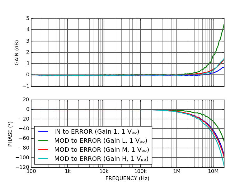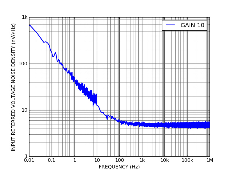 Input voltage noise measured for a gain of 10 between the input and the error signal output.