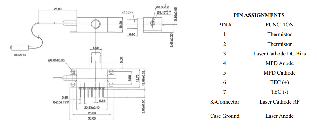DML系列直接調(diào)制激光二極管才有標準單模SMF-28e光纖輸出(可定制保偏尾纖輸出),阻燃涂層,900um套管,標準1m尾纖,5mm PIN腳間隔,已經(jīng)SC/APC接頭(可定制)。